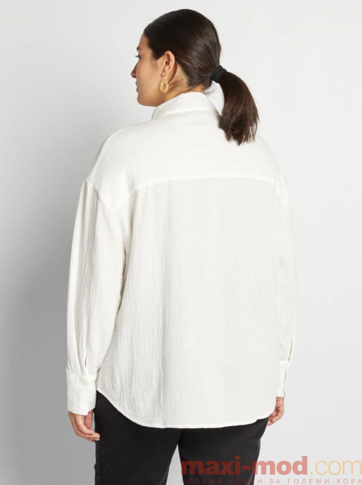 Моделът е с дълги ръкави, класическа яка и закопчаване с копчета по цялата дължина. Свободната кройка осигурява удобно прилягане и е подходяща за ежедневна или елегантна визия. Бялото е универсален цвят, който лесно се комбинира с всякакви дрехи и аксесоари.