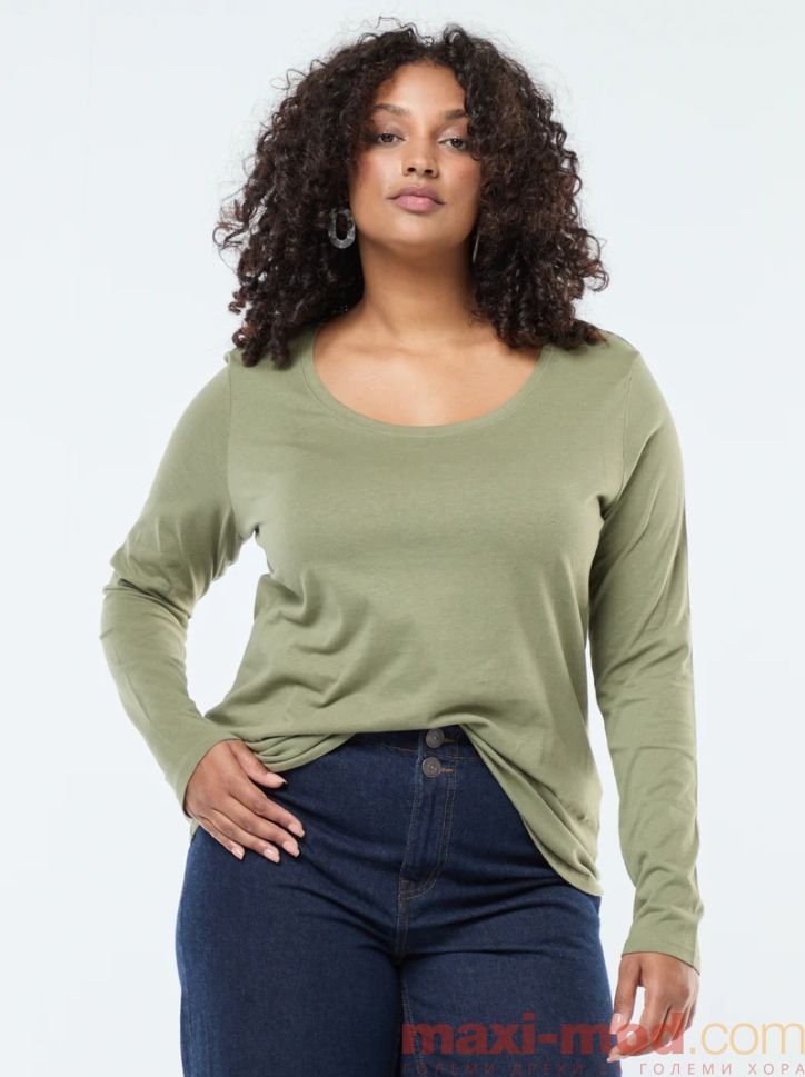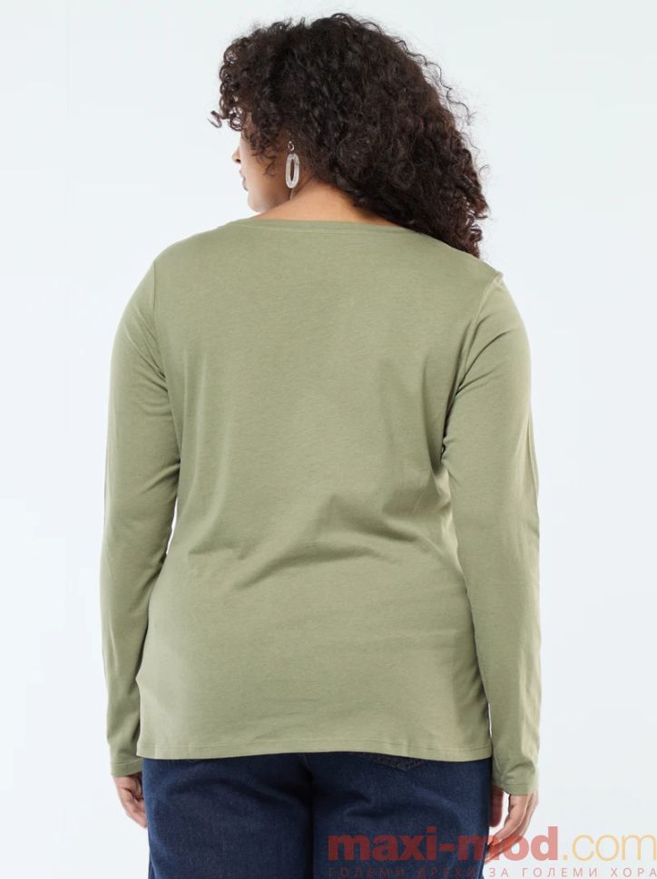 Голям размер тениска с дълъг ръкав от трико. Подходяща за ежедневието и свободното време.