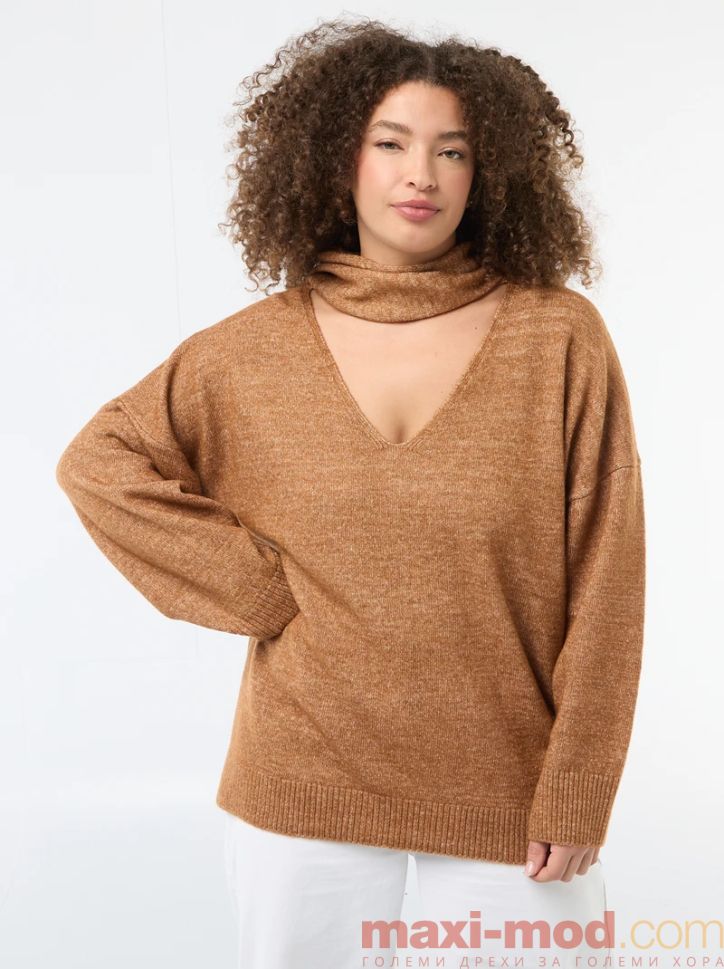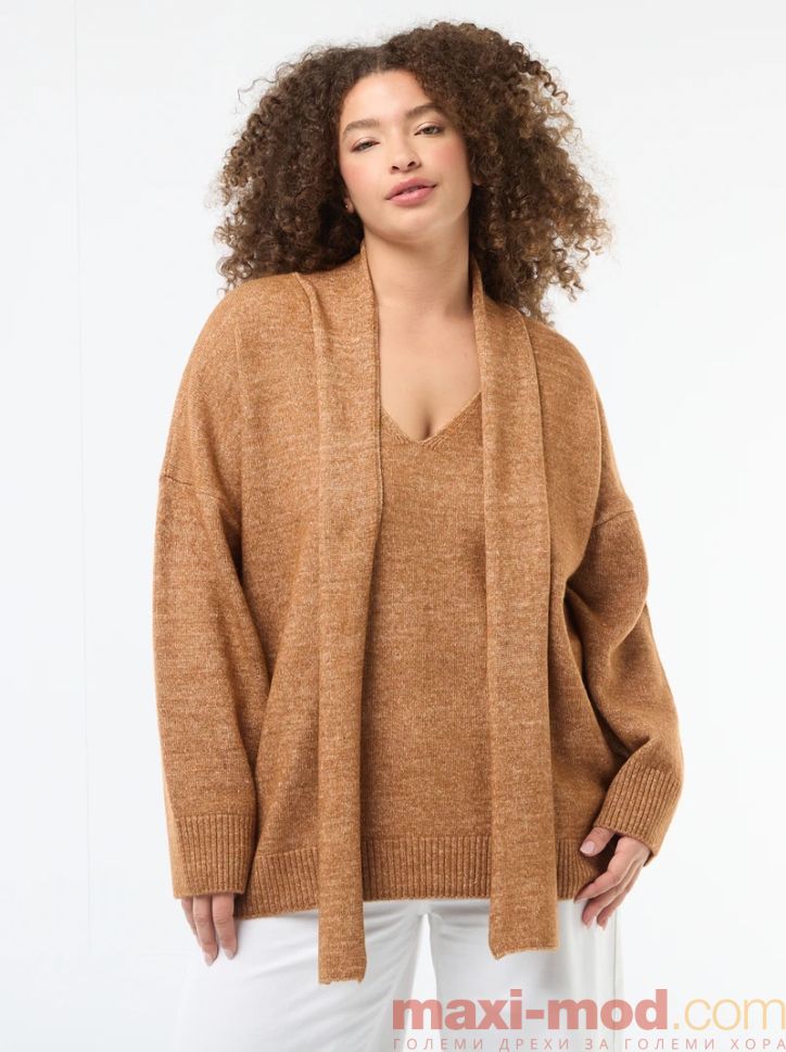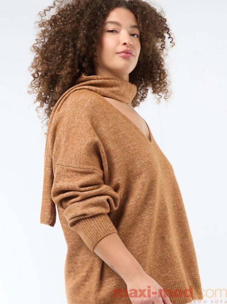 Дамски плетен пуловер с вграден шал . Подходяща за ежедневието и свободното време.
